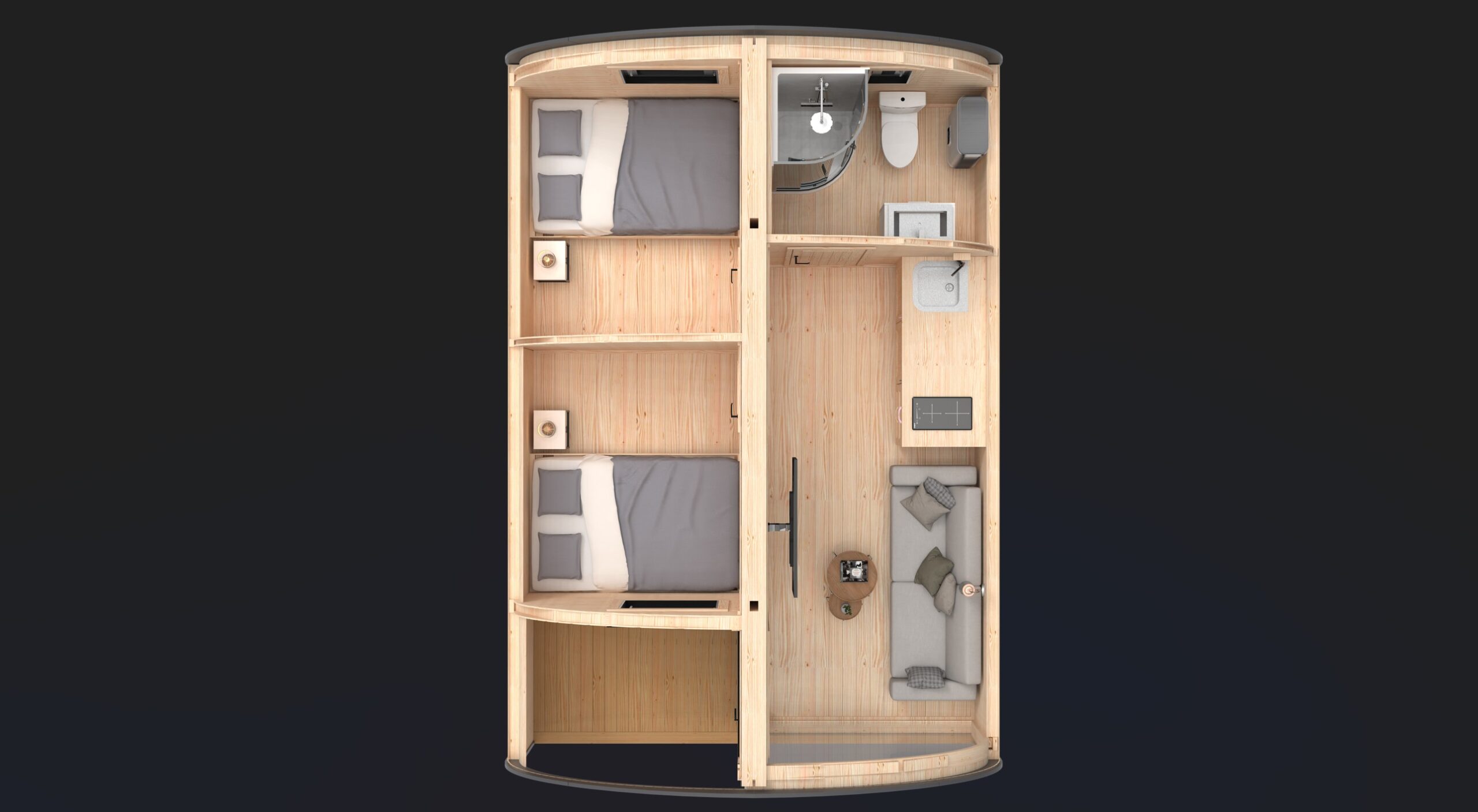 Binnenin vind je twee aparte slaapkamers, een badkamer, een volledig uitgeruste keuken en een gezellige woonkamer. Met een binnenruimte van ruim 23 m² en een optionele veranda van 1,4 meter diep is dit de meest complete Pod van Ticra tot nu toe. De ronde vorm en natuurlijke houtafwerking zorgen voor de vertrouwde warme uitstraling die past bij het merk.